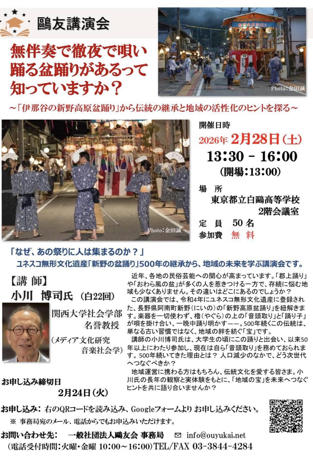 今月28日(土曜日)に 講演会を開催します。講師には白22回卒の小川博司氏(関西大学社会学部名誉教授)をお招きし、伝統文化の盆踊りと地域の関わりについてご講演いただきます。 講演内容、参加申込方法等は以下のシートをご覧ください。 皆様の御参加、お待ちしております。
